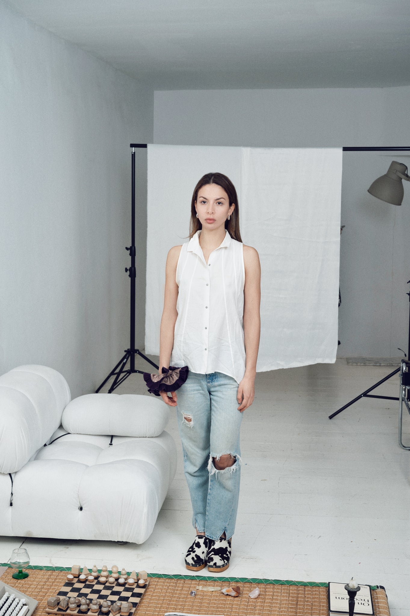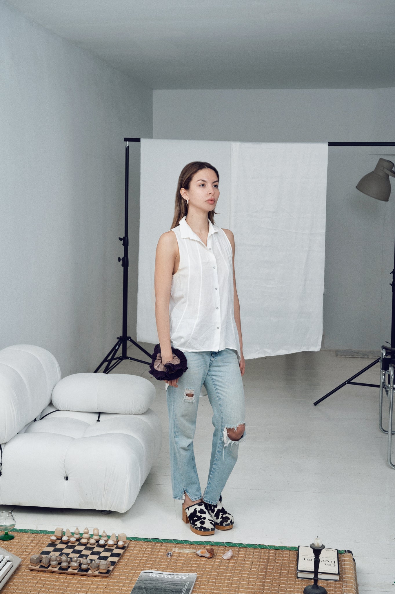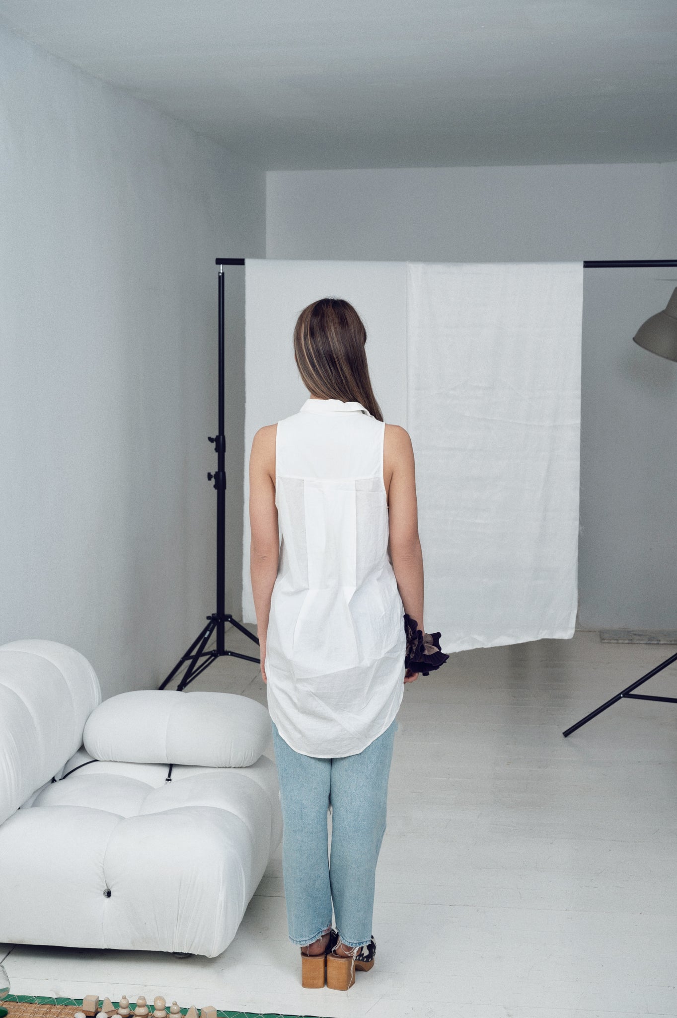 Embrace minimalist elegance with this Helmut Lang sleeveless shirt, designed with a contemporary twist. The shirt features a sleek, streamlined fit with a longer back that adds a touch of modern asymmetry. Front button detailing elevates the piece, making it perfect for layering or wearing solo. Crafted with attention to proportion and quality, this versatile shirt exudes understated sophistication, offering effortless style for any occasion. Ideal for those who appreciate subtle design with a bold statement